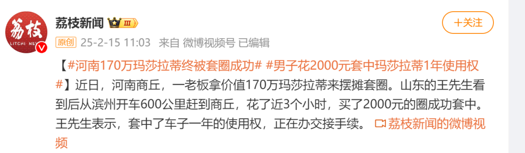 2月15日,据荔枝新闻消息,山东的王先生看到后从滨州开车600公里赶到商丘,花了近3个小时,买了2000元的圈,成功套中该车。